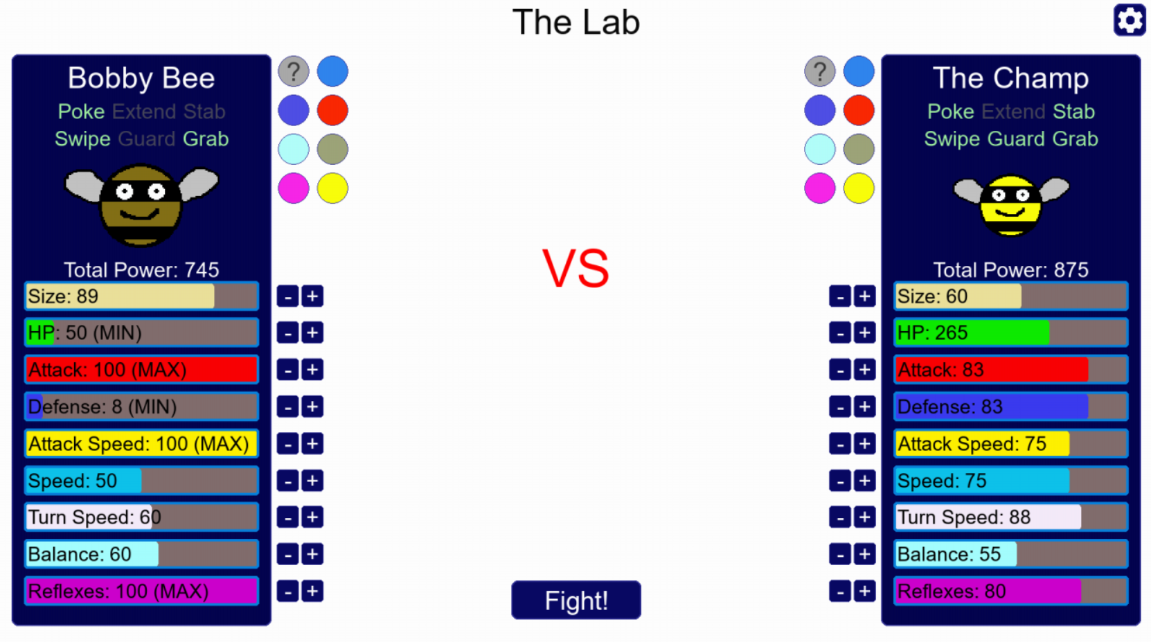 Today I'm adding a feature called The Lab! In The Lab you can create custom fights between bees. The "Total Power" stat is an estimate of the combined value of all of the bees' stats, so if you're looking for a challenge you can try to beat the preset bees with the lowest total power possible. Here's my record vs The Champ: